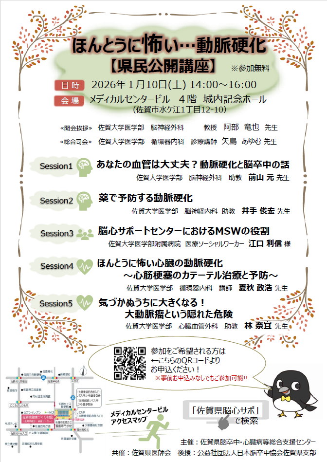 1月10日(土)、メディカルセンタービル4階の城内記念ホールにて県民公開講座を開催します。佐賀県脳卒中・心臓病等総合支援センターの主催により、当院の医師や医療ソーシャルワーカーなど、多職種が講演を行います。