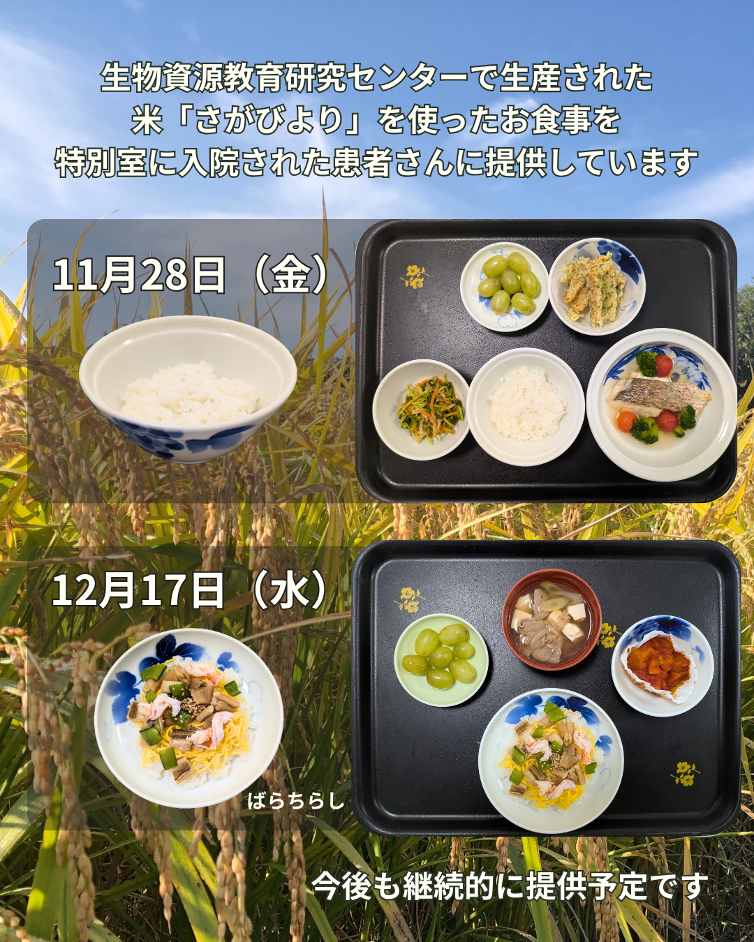 佐賀大学生物資源教育研究センターで生産されたお米「さがびより」を使ったお食事を特別室に入院された患者さんに提供しています。学内で生産した食材を当院で使用するのは初めての試みとなります。