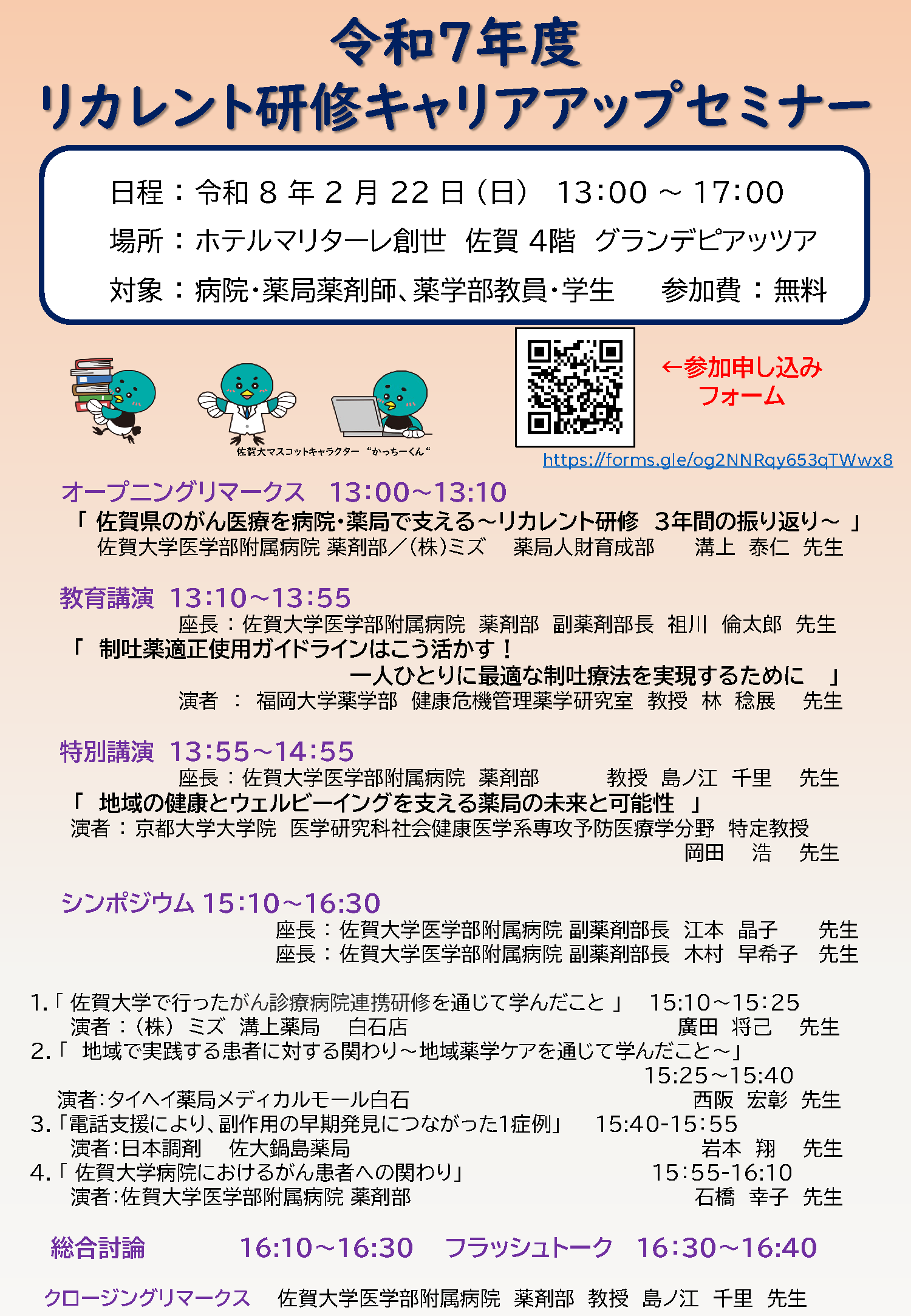 佐賀大学医学部附属病院薬剤部から、佐賀県リカレント研修制度事業による 最終仕上げの「キャリアアップセミナー!」のご案内です!