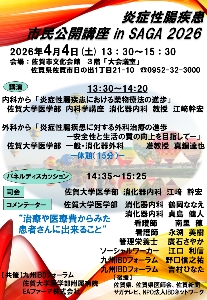 4月4日(土)、佐賀市文化会館3階「大会議室」にて炎症性腸疾患 市民公開講座inSAGA2026を開催します。佐賀大学医学部附属病院、九州IBDフォーラム、EAファーマ株式会社の主催により、当院の医師が内科治療や外科治療について講演を行います。また、「治療や医療費からみた患者さんにできる事」をテーマに多職種からなる当院の専門家と患者会によるパネルディスカッションも開催されます。