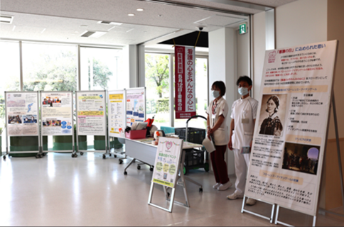 当院では「看護の心をみんなの心に」のテーマにちなんだ、当院看護職員が作成した看護週間ポスターとともに、災害対策展示と病気やケアに応じた災害時準備の情報提供、災害における当院看護師の活動の紹介を提示しました。