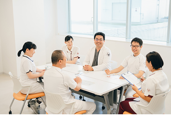 看護師は、患者さんの日常生活に最も近い立場として、食事量や嚥下機能、介助の様子などを把握し、医師や管理栄養士へ共有しています。各職種が専門性を発揮し、情報を持ち寄ることで、より安全で効果的な栄養管理を実現。月1回の勉強会や症例検討を通じて知識を高めながら、患者さんの早期回復と生活の質(QOL)の向上を目指しています。